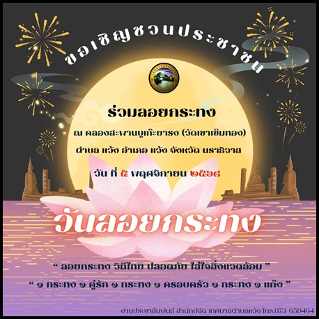 เชิญชวนประชาชน ร่วมลอยกระทง เทศบาลตำบลแว้ง ขอเชิญชวนประชาชน ร่วมลอยกระทง ณ คลองสะพานบูเก๊ะยารง (วัดเขาเข็มทอง) ตำบล แว้ง อำเภอ แว้ง จังหวัด นราธิวาส " ลอยกระทง วิถีไทย ปลอดภัย ใส่ใจสิ่งแวดล้อม" "๑ กระทง ๑ คู่รัก ๑ กระทง ๑ ครอบครัว ๑ กระทง ๑ แก๊ง "