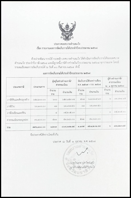 ประกาศเทศบาลตำบลแว้ง รายงานผลการจัดเก็บรายได้ประจำปีงงบประมาณ ๒๕๖๘ ประกาศเทศบาลตำบลแว้ง เรื่อง รายงานจัดเก็บรายได้ประจำปีงบประมาณ ๒๕๖๘