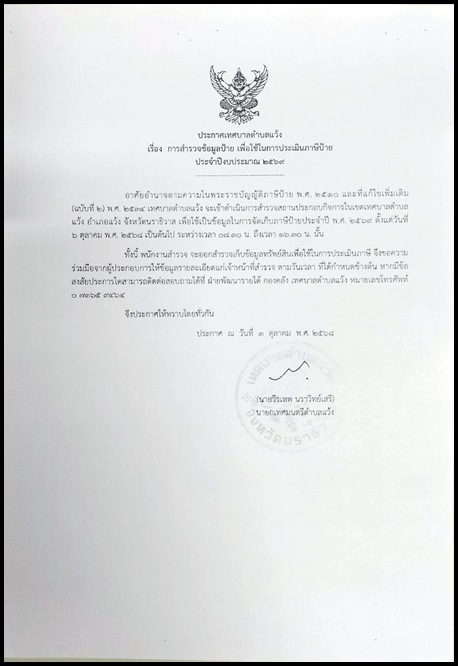 ประกาศเทศบาลตำบลแว้ง เรื่อง การสำรวจข้อมูลป้าย เพื่อใช้ในการประเมินภาษีป้าย ประจำปีงบประมาณ ๒๕๖๙