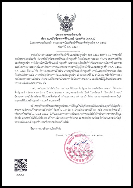 ประกาศเทศบาลตำบลแว้งเรื่องแบบบัญชีรายการที่ดินและสิ่งปลูกสร้าง (ภ.ด.ส.๓) ประกาศเทศบาลตำบลแว้งเรื่องแบบบัญชีรายการที่ดินและสิ่งปลูกสร้าง (ภ.ด.ส.๓)