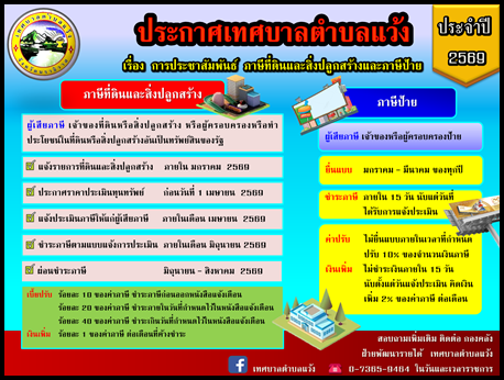 ประกาศเทศบาลตำบลแว้ง เรื่องขยายกำหนดเวลาดำเนินการตามพระราชบัญญัติภาษีที่ดินและสิ่งปลูกสร้าง พ.ศ.๒๕๖๒ ประจำปี ๒๕๖๙