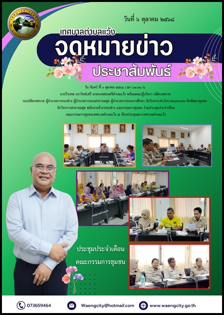 วัน จันทร์ ที่ ๖ ตุลาคม ๒๕๖๘ เวลา ๐๙.๓๐ น. นายวีรเทพ นราวิทย์เสรี นายกเทศมนตรีตำบลแว้ง พร้อมคณะผู้บริหาร ปลัดเทศบาล รองปลัดเทศบาล ผู้อำนวยการกองช่าง ผู้อำนวยการกองสาธารณสุข ผู้อำนวยการกองการศึกษา นักวิเคราะห์นโยบายและแผน นักพัฒนาชุมชน นักวิชาการสาธารณสุข พนักงานจ้างฯกองช่าง และกรรมการชุมชน