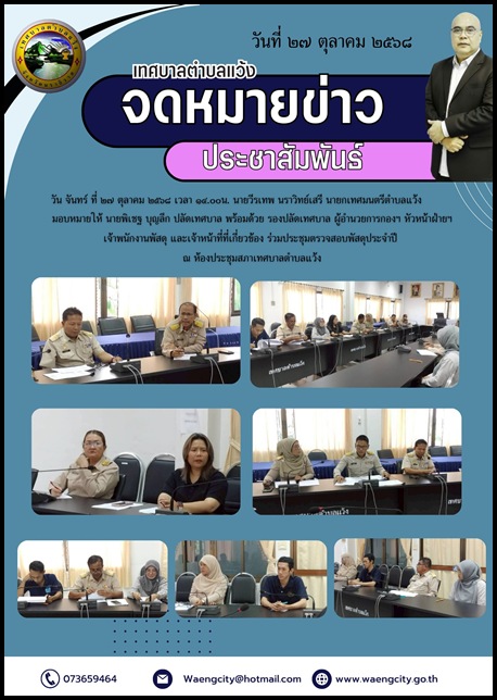 นายวีรเทพ นราวิทย์เสรี นายกเทศมนตรีตำบลแว้ง มอบหมายให้ นายพิเชฐ บุญลึก ปลัดเทศบาล พร้อมด้วย รองปลัดเทศบาล ผู้อำนวยการกองฯ หัวหน้าฝ่ายฯ เจ้าพนักงานพัสดุ และเจ้าหน้าที่ที่เกี่ยวข้อง ร่วมประชุมตรวจสอบพัสดุประจำปี