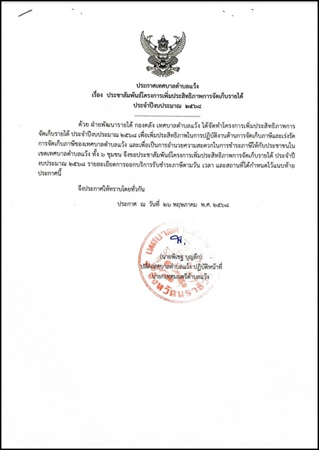 ประกาศเทศบาลตำบลแว้ง โครงการเพิ่มประสิทธฺภาพการจัดเก็บรายได้ ประจำปีงบประมาณ 2568 กำหนดการออกให้บริการรับชำระภาษีเคลื่อนที่ ประจำปีงบประมาณ 2568 เทศบาลตำบลแว้ง